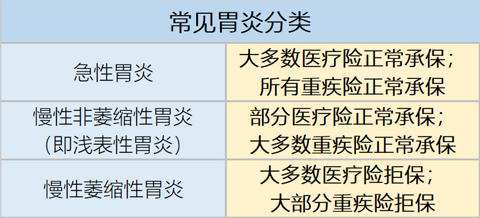 胃炎是我们生活中非常常见的疾病了,短时间的暴饮暴食或者长期的饮食不健康都容易导致胃炎。 而胃炎的症状缺乏特异性,其轻重程度与病变严重程度常不一致,当我们有所症状时,往往都已经发展到比较严重的程度了。 通常咱们都是通过肠镜来判断胃炎的严重程度,是否伴有糜烂、是否有溃疡等都是衡量胃炎严重程度重要的标志。 一、胃炎的医疗险攻略 不被诊断为“慢性萎缩性胃炎” √已痊愈超过1年且复查正常 √满足上面两个条件
