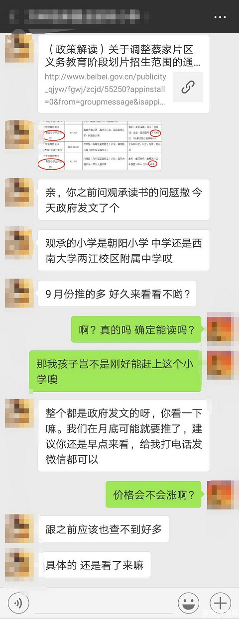 昨晚置业顾问给我发来一条消息,说是北碚区教委发布了官方消息,万科观承的业主可以入读朝阳小学...今天上论坛又看到三九哥发的帖子,这次应该是定下来了?之前去看房的时候置业顾问倒是说了可以读朝阳小学,但是一直没有什么官方消息,现在连正式的政府文件都下来了,我也跟老公说了,准备周末再去售房部问清楚。其实我一直都有点想下叉观承的,但是上次开盘5秒钟都不到就被抢光了。这次开盘应该要好抢些吧,他们本身房源应该