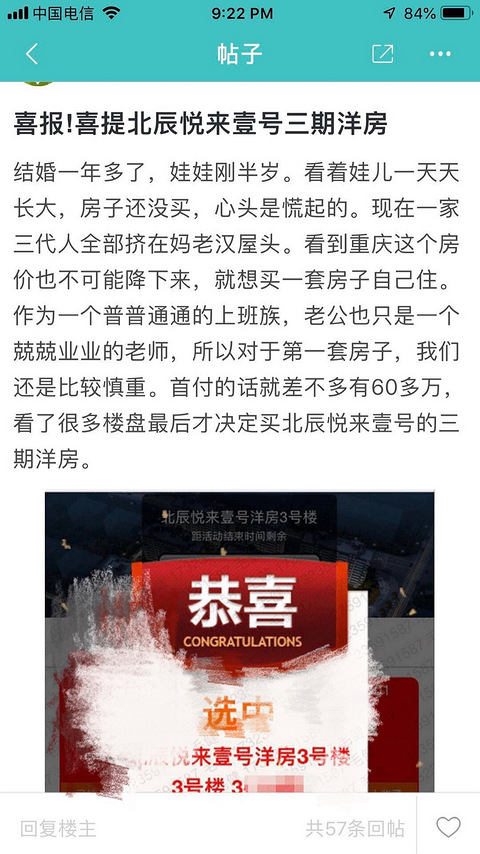 上周三北辰悦来壹号在微信上抢房,我抢到了其中一个,把截图发给了置业顾问张滔。 昨天晚上发现购物狂上面有人发帖说下叉了这个盘,用的图却是我的截图,上面还有我的名字和电话号码。 今天我跟我哥哥去北辰找他们谈怎么解决这个问题,那个罗经理一直就各种打太极,说我们联系了购物狂的,也问了他们的同事,这个帖子肯定不是他们发的,说什么会配合我们调查,但是今天该签合同还是签,不然过了两点没签合同公司还是会收回房