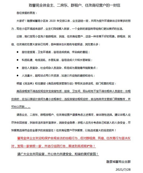 融景城馨苑小区禁止群租、民宿!业主的声音