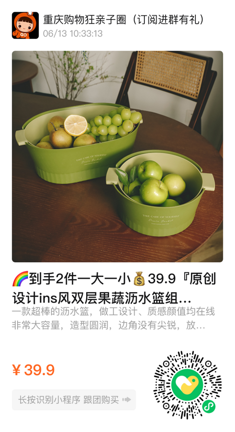 到手2件一大一小,39.9元get【原创设计ins风双层果蔬沥水篮组合装】 双层撞色沥水篮,灵感来源于抹茶蛋糕和板栗拿铁 一物多用,不止是沥水篮,还可以是客厅果盘,冷藏保鲜 底部防滑设计,叠放不占地,小厨房也能玩转收纳~
