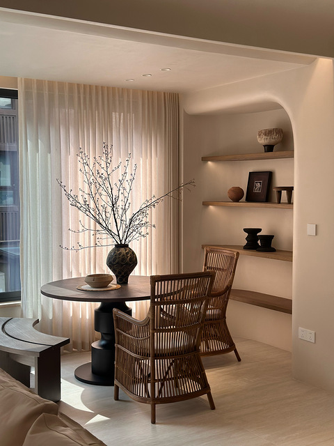 墙面利用墙体柱头厚度,齐平做了开放架,摆放装饰摆件及茶具用品,圆桌搭配休闲藤椅,让阳台休闲区氛围更加闲适,半圆做凳依照整体圆桌形体增加座位数,阳光好的午后都想在这里美美的喝个下午茶