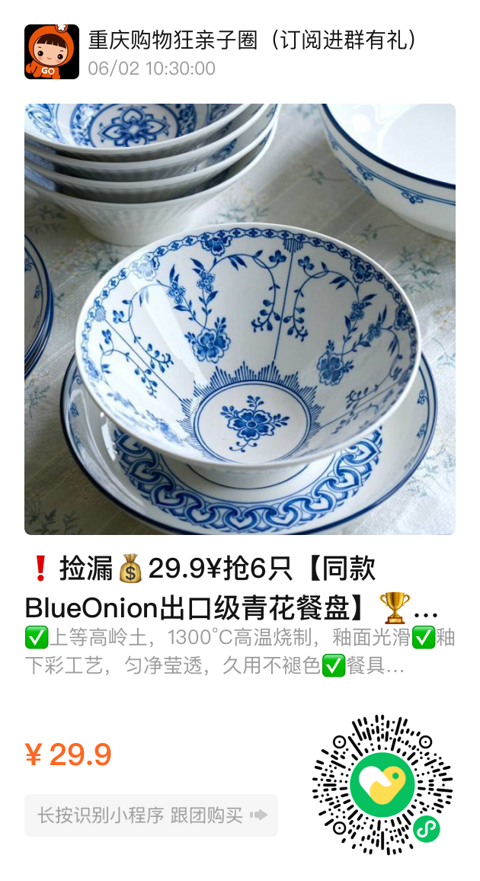 捡漏!!!29.9抢6只【同款BlueOnion出口级青花餐盘】皇家御用瓷器同款,出口定制款,艺术品级餐具淘宝价:?258/5只 团购价:?29.9/6只,立省?382.9 √上等高岭土,1300°C高温烧制,釉面光滑√釉下彩工艺,匀净莹透,久用不褪色 √餐具抛光细腻,耐低温、耐煮、不易碎