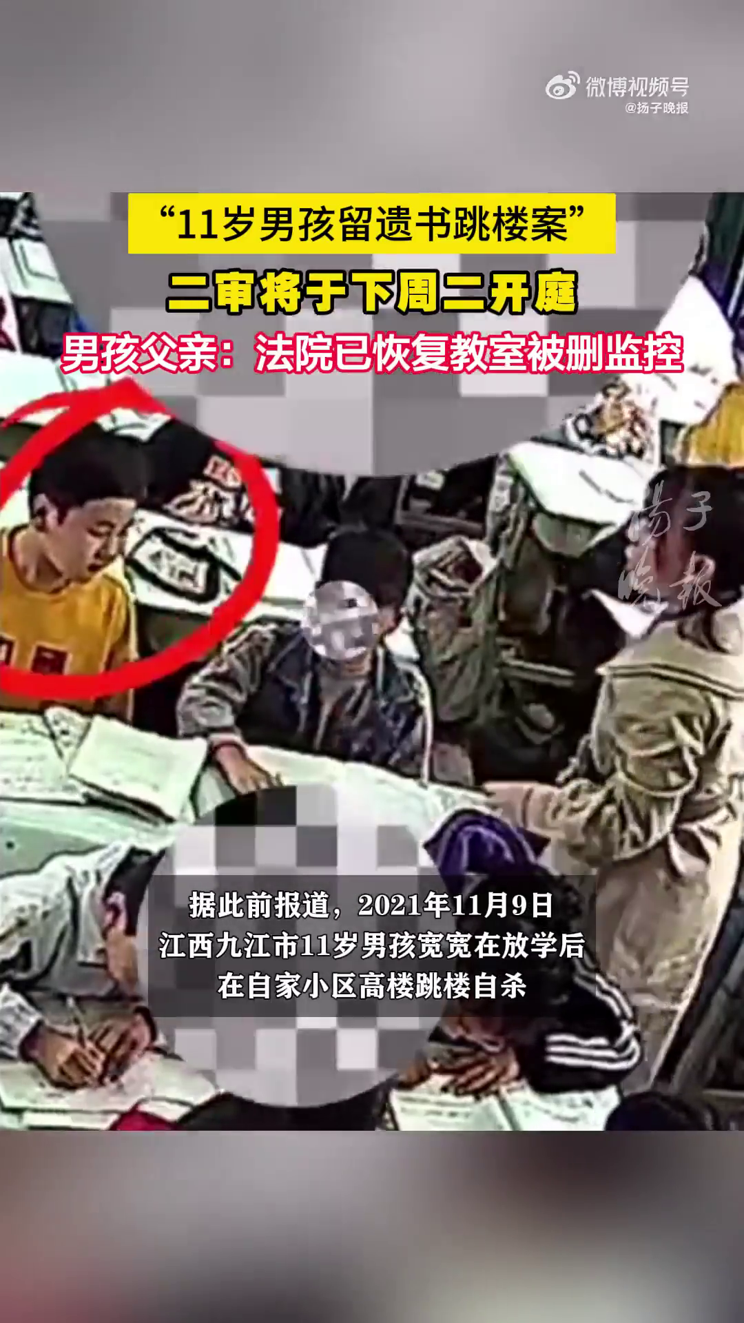 江西11岁男孩跳楼自杀,留下遗书指认班主任用暴力手段,其父母刑事自诉孩子班主任侮辱罪、虐待被看护人罪一案,法院一审宣判被告人邹某无罪。当时男孩父亲张定杰当庭提出上诉。11月16日,张定杰告诉@扬子晚报 紫牛新闻记者,目前二审开庭时间已经确定,“将会在下周二,11月21日在九江市中级人民法院开庭审理。”#江西11岁男孩跳楼案二审下周开庭# 张定杰向记者透露,此次二审他们还会提交一些最新证据,“另外