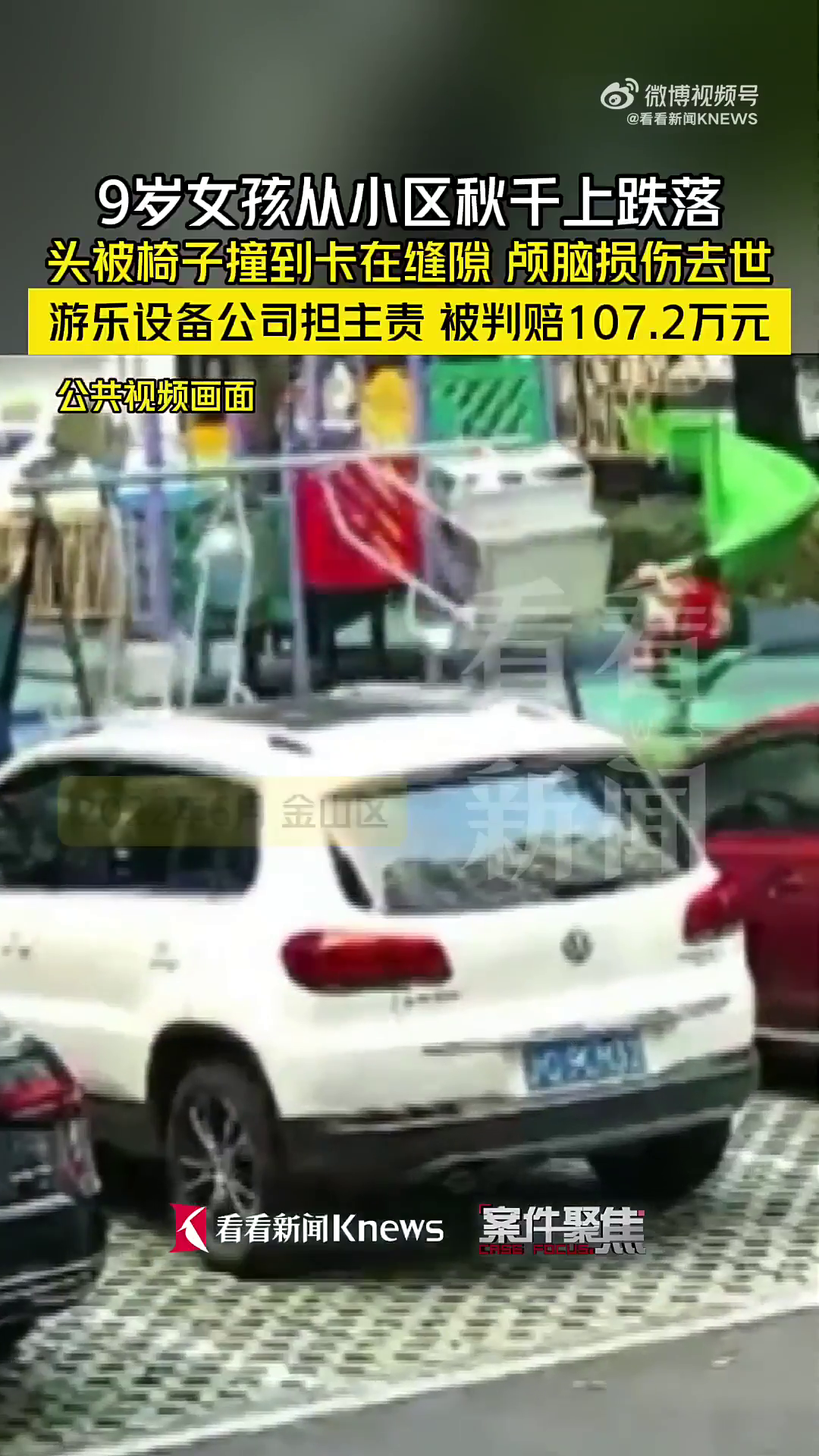 【#9岁女孩秋千跌落身亡设备公司被判赔107万#】2022年6月,两个9岁女孩小樱和小可在小区游乐中心玩秋千,为了寻求刺激,两人并排站立在秋千的脚踏板处,将秋千荡得很高。此时,小樱的爸爸和奶奶在较远处与旁人聊天。突然,小樱因无处抓握,从正在摆荡的秋千上跌落,被秋千底部击中头部,并卡在了地面与秋千之间。 小樱因重度颅脑损伤,经抢救无效于当日死亡。小樱家长悲痛欲绝,认为涉案秋千的设计有问题,才导致悲剧