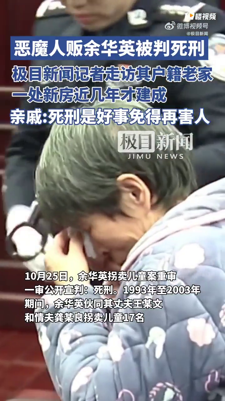 【#余华英老家亲属发声##想到余华英丈夫给孙子糖就害怕#】10月25日,余华英拐卖儿童案重审一审公开宣判:被告人余华英犯拐卖儿童罪,判处死刑,剥夺政治权利终身,并处没收个人全部财产。 法律文书显示,1993年至2003年期间,余华英伙同其丈夫王某文和情夫龚某良在贵州、云南、重庆等多地流窜作案,物色儿童进行拐卖。得手后将被拐儿童带至河北省邯郸市,通过他人介绍,寻找收买人进行买卖,以此获利,10年间共