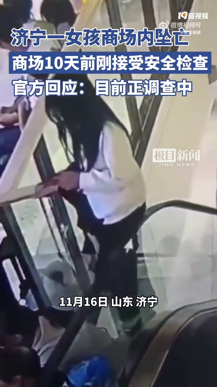 【#官方回应济宁一女孩商场内坠亡#:目前正在调查中】#济宁一女孩商场内坠亡# 11月16日晚,山东济宁大型商场万象汇内,一女孩从高空坠落不幸身亡。 视频显示,这个白衣女孩站在手扶电梯旁的一个夹角处,身后是一个不到1米高的玻璃护栏,后女孩失去重心从楼上坠下。 据了解,此发生于济宁万象汇4楼,该商场11月2日才开业。11月17日,极目新闻记者致电济宁高新区应急局和接庄派出所,工作人员表示,此事目前正在