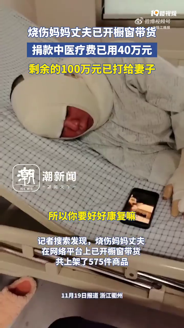 【#烧伤妈妈丈夫开橱窗带货上架575件商品#】11月19日,浙江衢州,“烧伤妈妈”的丈夫发布了妻子的复健视频。 记者搜索发现,他在网络平台上已开橱窗带货,共上架了575件商品。近日,他接受媒体采访时称,收到捐款140万,其中医疗费已用40万,剩余的100万已打给妻子。