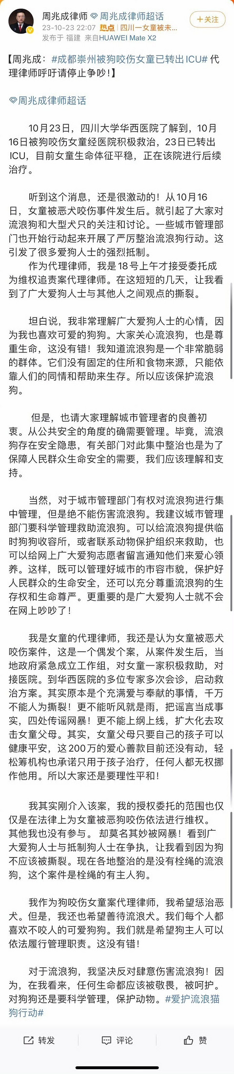 #女童被咬案代理律师呼吁停止争吵# 10月23日,四川成都,据新华社消息,崇州被狗咬伤女童已转出ICU,目前生命体征平稳,正在该院进行后续治疗。晚上,该案代理律师@周兆成律师 发文呼吁请停止争吵! 周律称,女童父母只要自己的孩子可以健康平安,这200万的爱心善款目前还没有动,轻松筹机构也承诺只用于孩子治疗,任何人都无权挪作他用。所以大家还是要理性平和!“对于流浪狗,我坚决反对肆意伤害流浪狗! 因