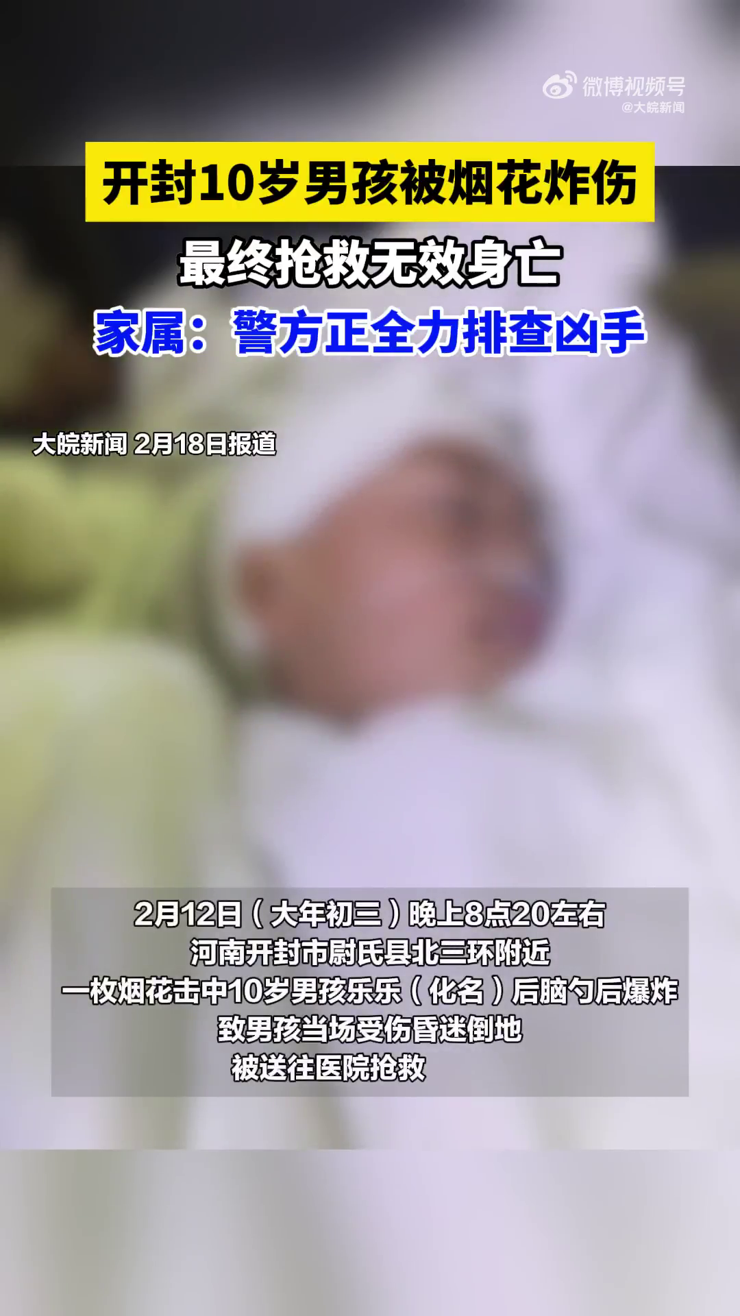 #10岁男孩被窜出的烟花炸伤身亡#【河南10岁男孩被窜出的烟花炸伤身亡,家属:警方正全力排查凶手】据大皖新闻 龙年春节,对于河南开封的乐乐(化名)一家人来说,过得尤为沉重。2月17日下午,经过5天的全力抢救,乐乐最终还是离开了人世。“人没了,昨天下午走的。”2月18日上午,乐乐的二姑悲伤地告诉记者。这一切,只因大年初三夜,一枚烟花。 乐乐的事,被越来越多的人知晓,源自于一条两天前的“寻找目击证人”