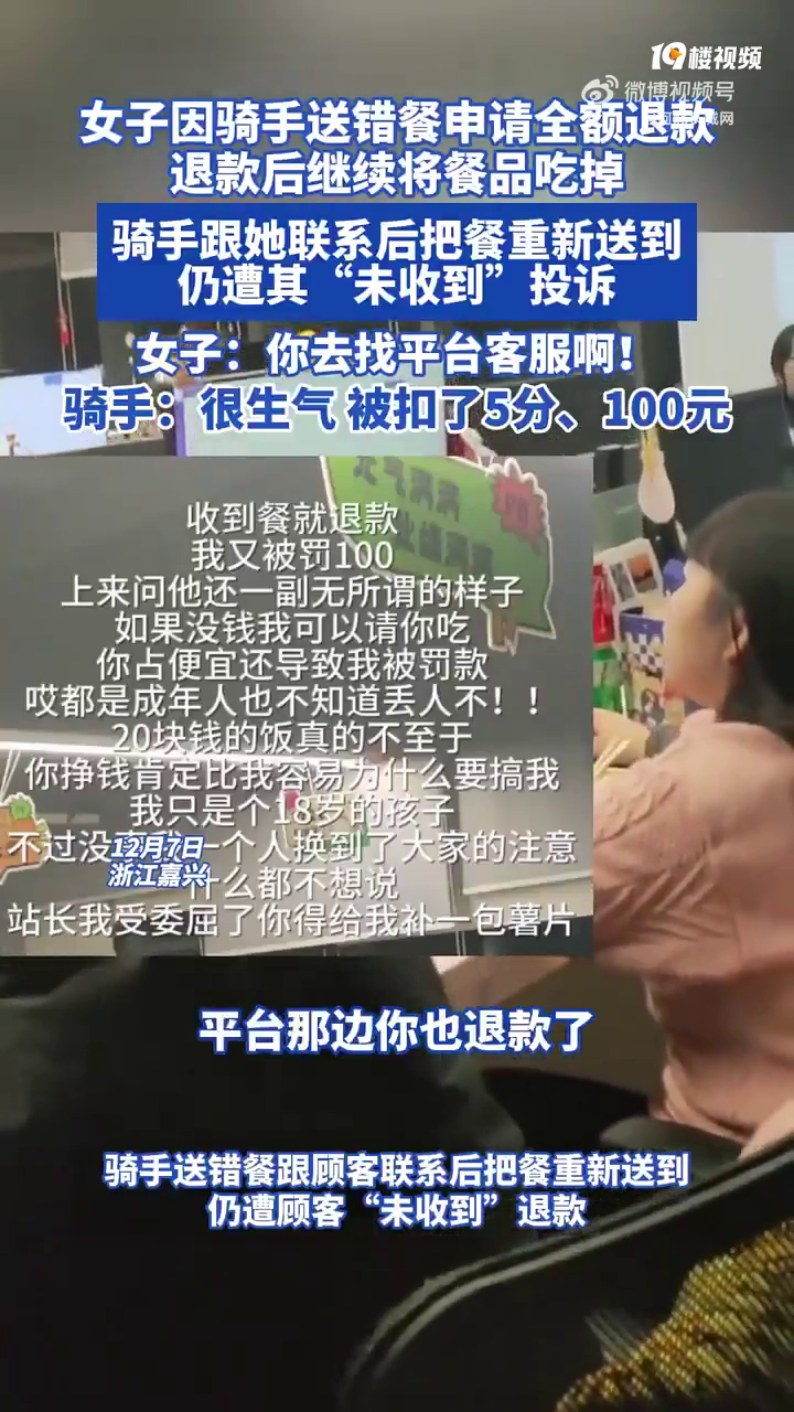 【#女子因骑手送错餐申请退款后将餐品吃掉#】12月7日,浙江嘉兴。女子因骑手送错餐申请退款后继续将餐品吃掉,骑手跟女子联系后把餐重新送到,仍遭其“未收到”投诉。女子:你去找平台客服啊! 骑手:很生气,被扣了5分、100元。#骑手与顾客联系送回餐食仍遭其投诉#(津云)#嘉兴[地点]# @河北长城网