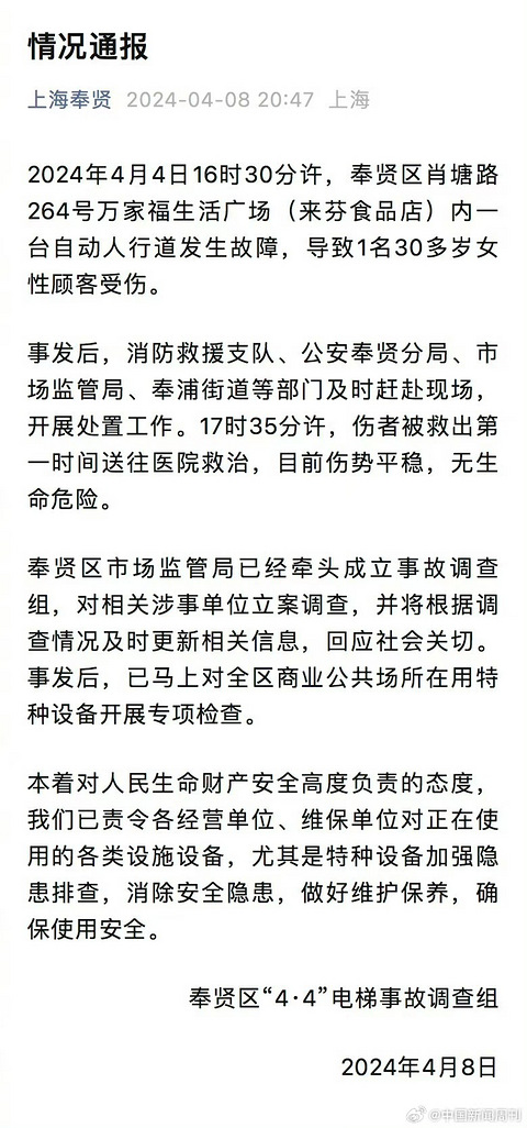 【#官方通报女子被卷入超市电梯# 对相关涉事单位立案调查】2024年4月4日16时30分许,奉贤区肖塘路264号万家福生活广场(来芬食品店)内一台自动人行道发生故障,导致1名30多岁女性顾客受伤。 事发后,消防救援支队、公安奉贤分局、市场监管局、奉浦街道等部门及时赶赴现场,开展处置工作。17时35分许,伤者被救出第一时间送往医院救治,目前伤势平稳,无生命危险。 奉贤区市场监管局已经牵头成立事故调查