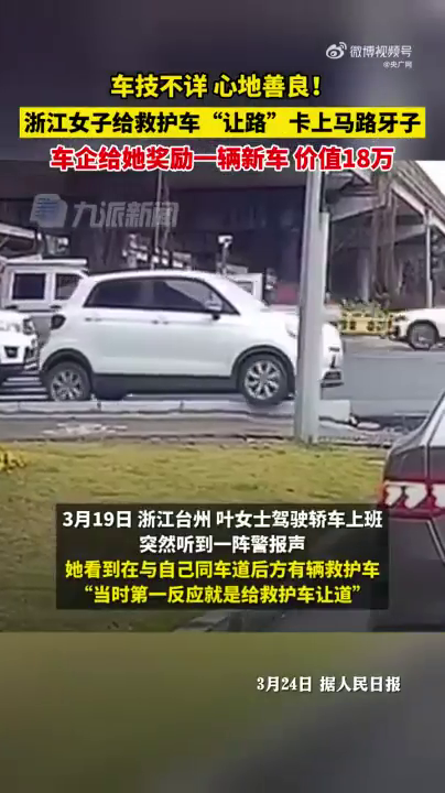 @九派新闻 消息,近日,台州一女子因为礼让救护车,导致自己的车辆卡在马路上,引起网友热议。 3月27日,九派新闻从浙江台州市路桥区委宣传部获悉,叶女士原名叶冰馨,在温岭市爱仕达电器有限公司上班。 18日8时许,她正在上班路上,等红灯时听到后面传来救护车的声音。叶女士就想着给救护车让道,但是前面就是红灯,如果自己继续行驶,会有很大的安全隐患。 “我当时想着靠右给他让一下路,没看到马路牙子有这么长,