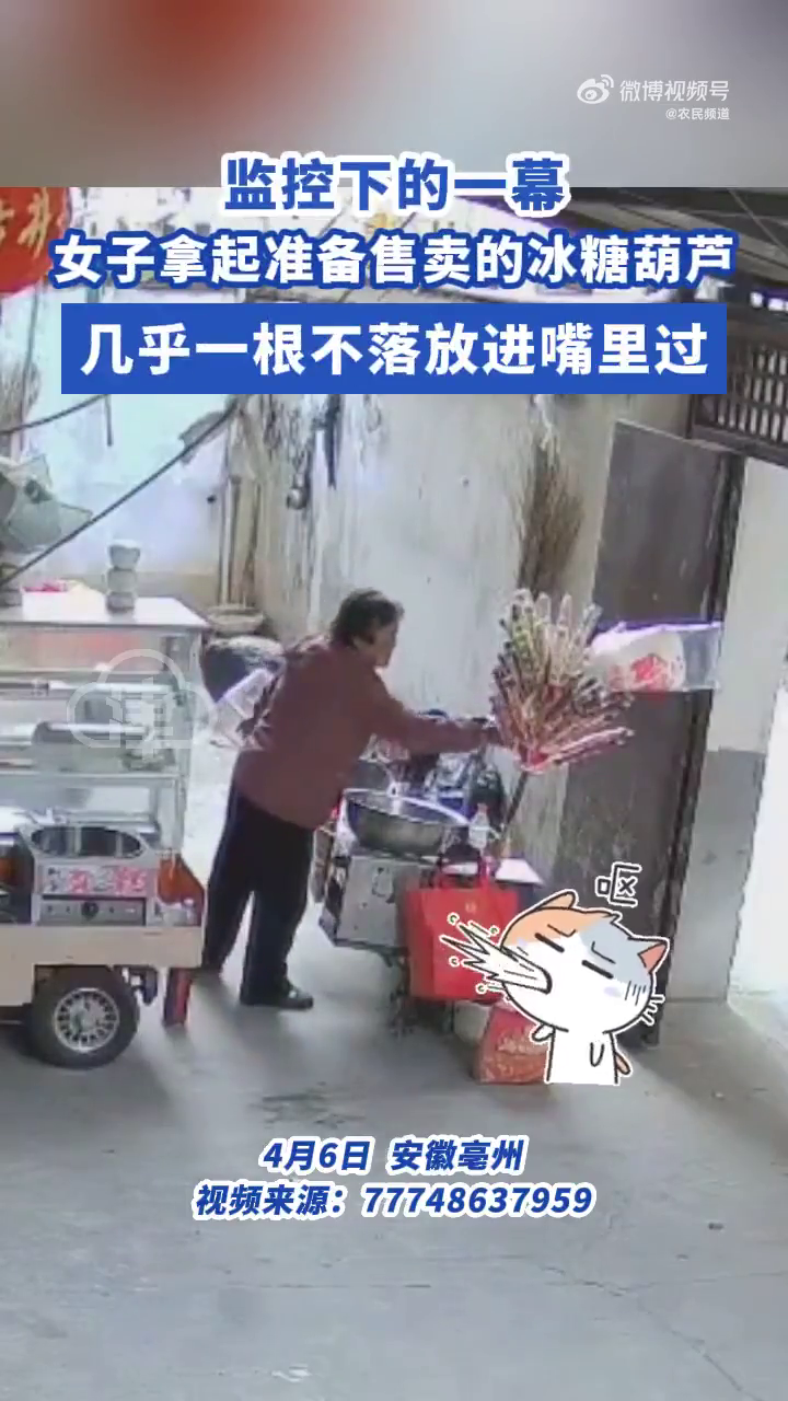 【#女子卖糖葫芦前每根都舔一遍#[衰][衰][衰]】近日,安徽亳州。监控拍到一名女子出摊前,将准备售卖的“冰糖葫芦”每一根都放进嘴里舔一遍......[融化][融化][融化]网友:这咋还是“进口糖葫芦”!(津云) @农民频道