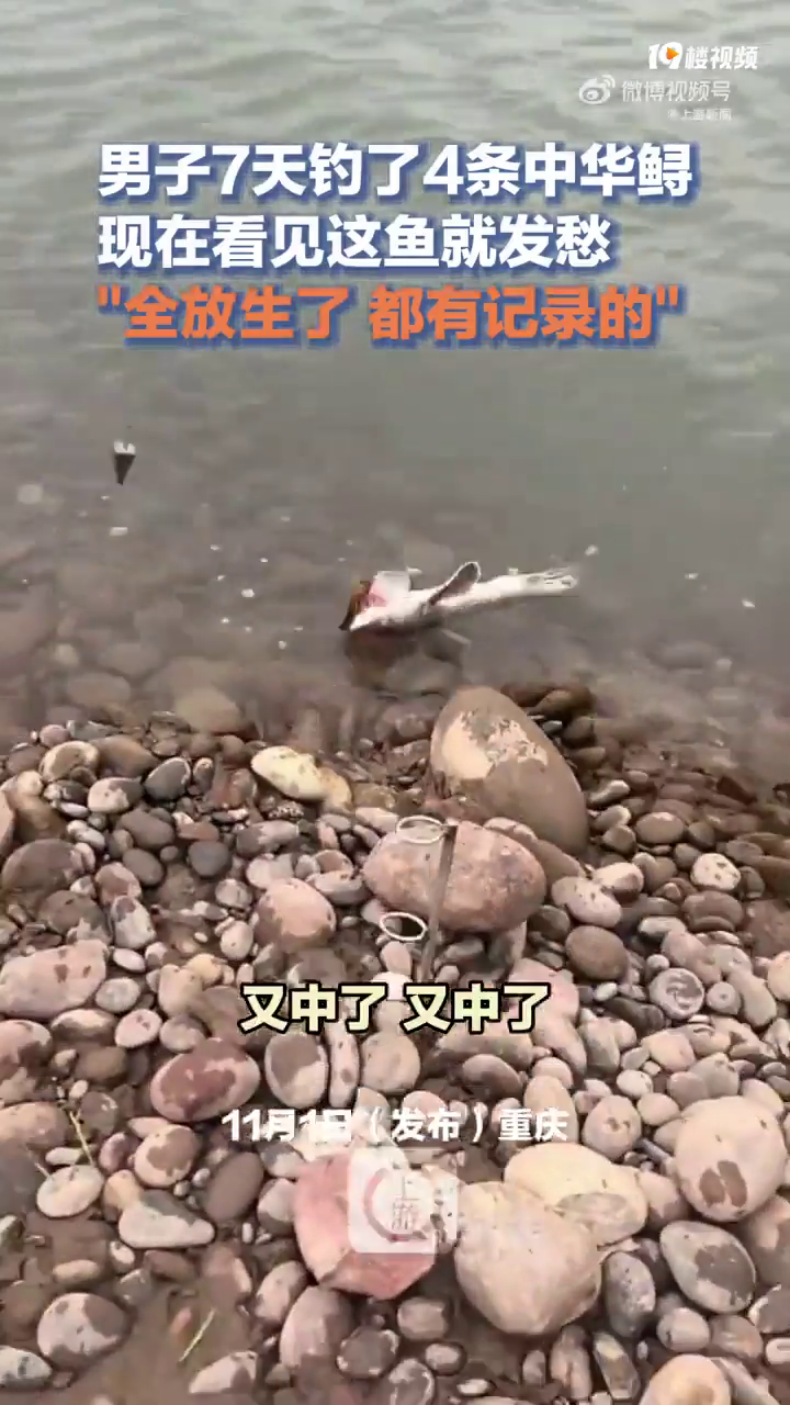 11月1日(发布)重庆,男子7天钓了4条中华鲟,现在看见这鱼就发愁,"全放生了 都有记录的"。来源:上游新闻