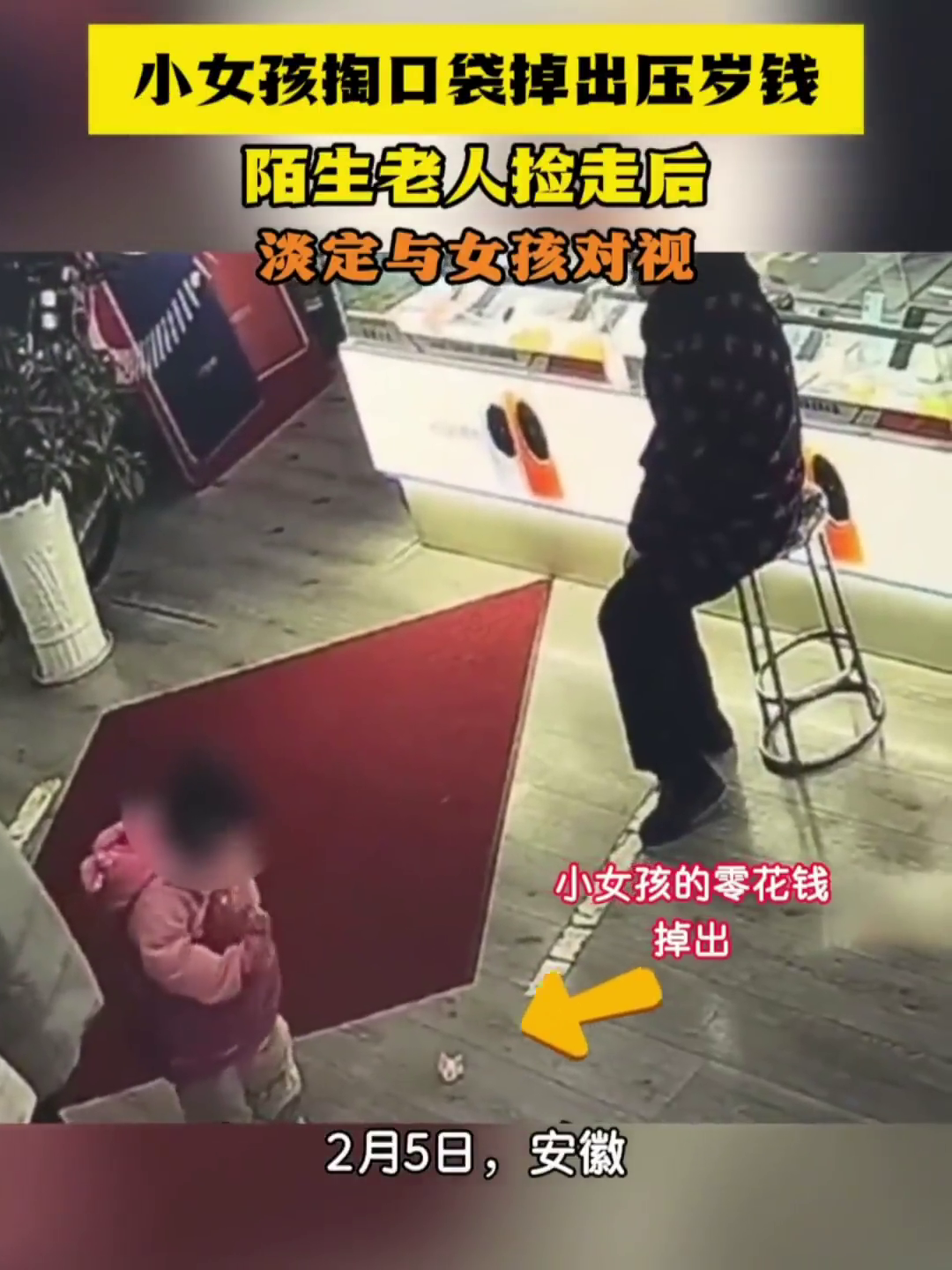 2月5日,安徽。小女孩掏口袋时不小心掉出压岁钱,陌生老人直接将钱捡走,捡完淡定与小女孩对视,小女孩不知所措转身离开,陌生老人立即将钱揣到自己兜里。?#小女孩的压岁钱被陌生老太捡走#(新快报)