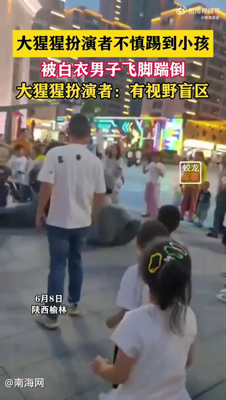 【这样的人就不要带孩子出门了,大猩猩扮演者不慎踢到小孩被男子飞脚踹倒#】#蛟龙军事# 6月8日,陕西榆林,大猩猩扮演者不慎踢到小孩,被白衣男子飞脚踹倒,大猩猩扮演者:有视野盲区!