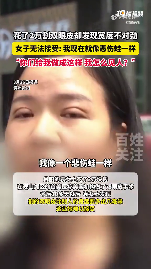 8月8日,贵阳的袁女士花了2万块钱在一家医疗美容机构做了双眼皮手术,术后10多天以后,袁女士发现割的双眼皮宽度比别人要多出几毫米,这让她难以接受,“我就像个悲伤蛙一样”,“做成这样我怎么见人”。于是袁女士想要找院方退钱,院方表示现在并不能判定是手术失败了,让她再观察一段时间看看恢复情况,然而袁女士始终无法接受。双方经过长时间的协商依然无法达成一致意见。之后袁女士来到贵州省人民医院医学美容科进行检查