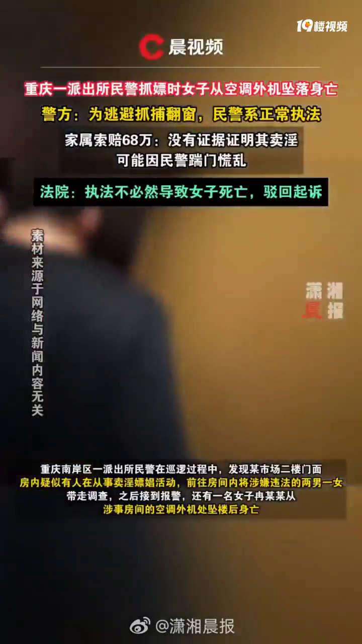 【#警方抓嫖时女子从空调外机坠落身亡#,家属索赔68万,判了】#警方抓嫖时女子坠亡家属索赔68万# 重庆南岸区一派出所民警在巡逻过程中,发现某市场二楼门面房内疑似有人在从事卖淫嫖娼活动,前往房间内将涉嫌违法的两男一女带走调查,之后接到报警,还有一名女子冉某某从涉事房间的空调外机处坠楼后身亡。冉某某的家属后请求当地公安局对冉某某的死作出赔偿遭拒后,将公安局告上法庭,并索赔68万。10月22日,@潇湘