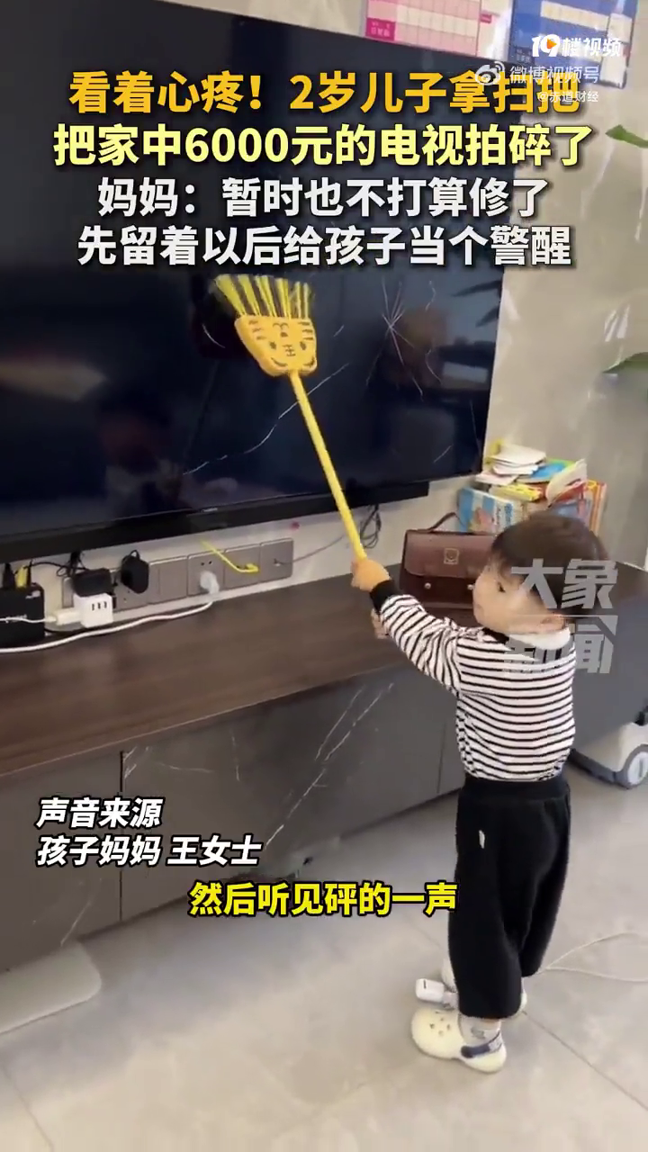 11月9日(采访),江苏江阴。看着心疼!2岁儿子拿扫把,把家中6000元电视拍碎了,妈妈:暂时也不打算修了,先留着以后给孩子当个警醒。网友:真的要这么教育孩子吗?[允悲](大象新闻)