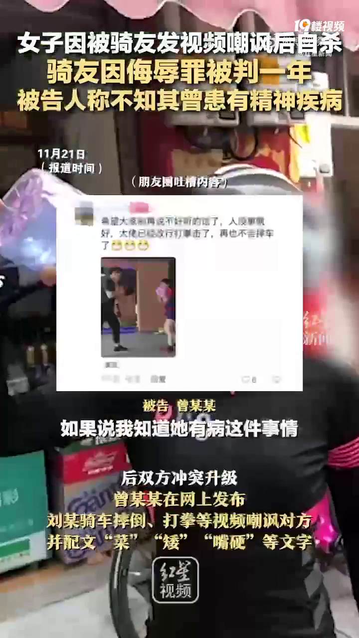 【#女子被骑友发视频嘲讽后自杀#,骑友因侮辱罪被判一年 被告人:不知其曾患有精神疾病】#涉事骑友回应女子被其嘲讽后自杀# #女子被嘲讽后自杀涉事骑友被判1年# 2023年4月,因被删好友并被评价“少一些乌烟瘴气”,厦门曾某某与刘某产生矛盾。 后双方冲突升级,曾某某在网上发布刘某骑车摔倒、打拳等视频嘲讽对方,并配文“菜”“矮”“嘴硬”等文字。2023年6月,刘某于湖中溺亡,警方在她垃圾桶内找到一纸条