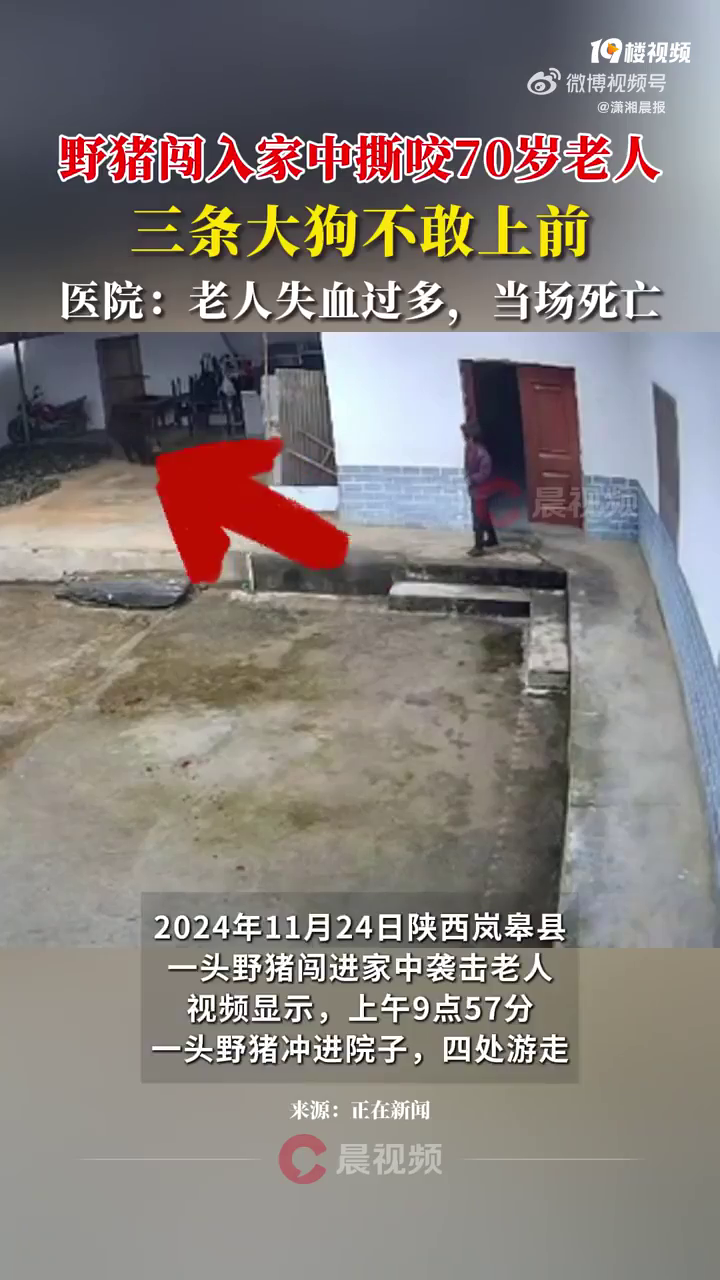 11月24日,网传视频显示,在陕西岚皋县,一头野猪闯进家中袭击老人。从监控画面可以看到,野猪袭击老人的情况发生在上午9点57分,有一名老人听到院子里的声响,从房屋内走出,与野猪在门口相遇,野猪突然撞向老人,并对老人进行撕咬,老人从台阶摔到地上,躺在地面一动不动,腰部流出大量鲜血。视频中,院子里三条狗试图上去帮忙,但完全不是野猪的对手。 11月25日,@潇湘晨报 记者从岚皋县林业局了解到,上述事件发
