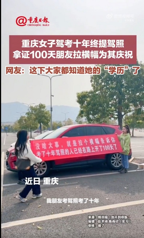 近日,重庆一女子拿下驾照100天,朋友拉横幅为其庆祝。据悉,该女子考驾照考了十年,科目二考了无数次,从20岁考到30岁。(重庆日报)