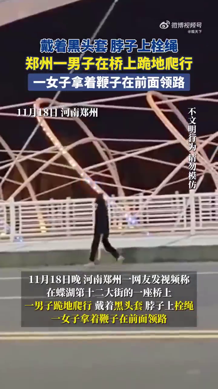 女子拿着鞭子在前面领路 11月18日,河南郑州。一男子在桥上跪地爬行,戴着黑头套,脖子上栓绳,一女子拿着鞭子在前面领路,11月19日南昌广播电视台记者联系到目击者对方介绍事发时间为晚上8时20分左右。 目击者称:男的头上戴一狗头头套在爬,女子拿鞭子在前面领路在前面领着,大约持续了有几分钟,从桥头爬到另外一头,大概爬行了100米左右,最后他们上车走了。@观天下