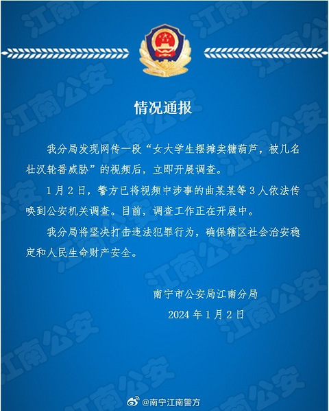 据@南宁江南警方 通报,南宁市公安局江南分局发现网传一段“女大学生摆摊卖糖葫芦,被几名壮汉轮番威胁”的视频后,立即开展调查。1月2日,警方已将视频中涉事的曲某某等3人依法传唤到公安机关调查。目前,调查工作正在开展中。@西部决策 #男子踩踏老人菜摊被行拘#