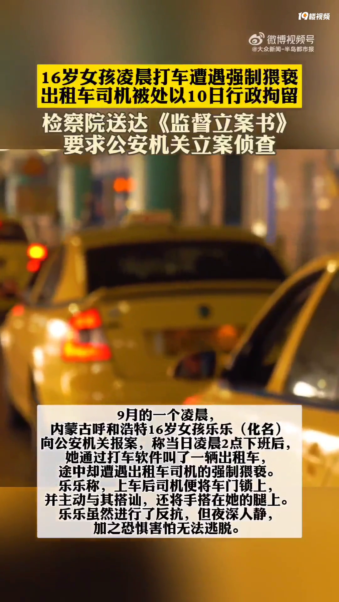 【#16岁女孩凌晨打车被司机强制猥亵# ,司机被行拘10日未刑事立案,检察院要求立案侦查】近日,呼和浩特市回民区人民检察院监督立案的一起出租车司机涉嫌猥亵女乘客案,由公安机关移送该院审查起诉。#司机猥亵女乘客被行拘检察院要求立案# 9月的一个凌晨,16岁女孩乐乐(化名)向公安机关报案,称当日凌晨2点下班后,她通过打车软件叫了一辆出租车,途中却遭遇出租车司机的强制猥亵。乐乐称,上车后司机便将车门锁