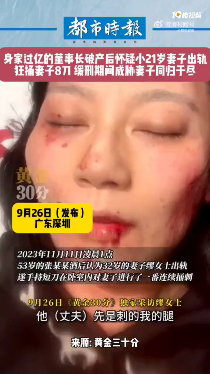 【#男子破产后捅妻子8刀获刑9个月#】近日,广东深圳。一男子因怀疑妻子出轨,捅妻子8刀获刑9个月,缓刑期间还威胁妻子同归于尽。 据了解,该男子原在证券公司任董事长一职,身家过亿,廖女士比其小21岁,结婚后廖女士才发现其患有双相情感障碍,情绪敏感且极其不稳定。当事人廖女士介绍说:“我身上一共是8刀,我当时想跑,但是他先把我的腿上刺了三刀,我就跑不掉了。”廖女士还表示:“他出狱后说的话,我觉得都是想要