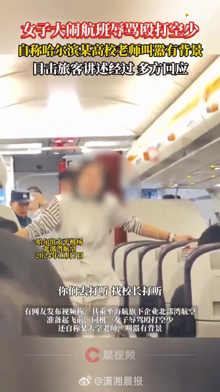 【#女子飞机上辱骂殴打空少自称有背景#,称自己是哈尔滨某高校老师,目击旅客讲述经过】11月7日,有网友发布视频称,其乘坐海航旗下企业北部湾航空航班准备起飞前,同机一女子辱骂殴打空少,还自称哈尔滨某高校老师,叫嚣“有背景”。视频显示,女子面向飞机上的乘客放狠话:“没事啊,我不怕啊,你们去打听,找校长打听”。她的身后站着空乘人员和警察。 7日晚,潇湘晨报记者联系到了上述视频的发布者官女士,据其介绍,她