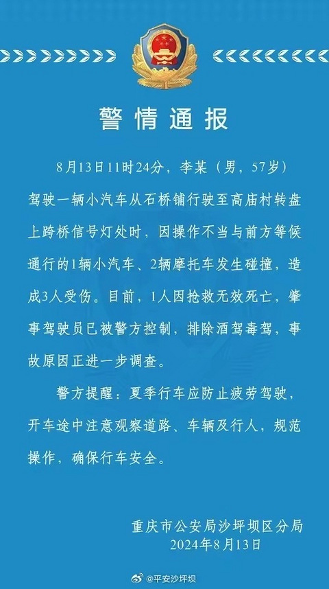 重庆市公安局沙坪坝区分局通报,8月13日11时24分,李某(男,57岁)驾驶一辆小汽车从石桥铺行驶至高庙村转盘上跨桥信号灯处时,因操作不当与前方等候通行的1辆小汽车、2辆摩托车发生碰撞,造成3人受伤。目前,1人因抢救无效死亡,肇事驾驶员已被警方控制,排除酒驾毒驾,事故原因正进一步调查。