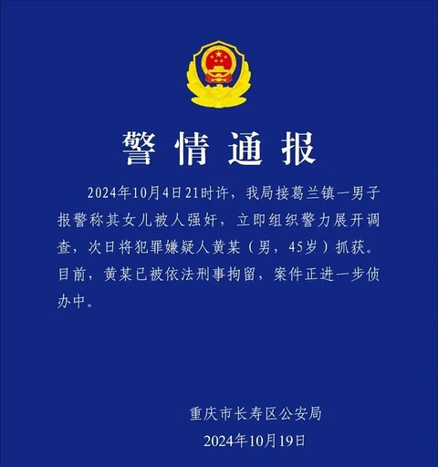 10月19日,重庆市长寿区公安局发布警情通报称:2024年10月4日21时许,我局接葛兰镇一男子报警称其女儿被人强奸,立即组织警力展开调查,次日将犯罪嫌疑人黄某(男,45岁)抓获。目前,黄某已被依法刑事拘留,案件正进一步侦办中。