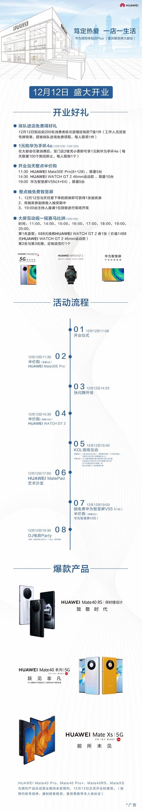 12月12日,华为授权体验店Plus店大都会店开业这是国内首家位于核心CBD的华为授权体验店Plus店正对解放碑标志建筑,661平方米的店面分为上下两层,双主门设计一层展示了华为的智慧全产品及互动呈现二层则像一个宽阔舒适的私享体验空间预测,会成为下一个网红打卡点 12月12日开业当天,还有各种很给力的活动活动当天前200名消费者获赠定制TEE一件1元购华为手环4e半价抢华为MATE 30E半价抢华
