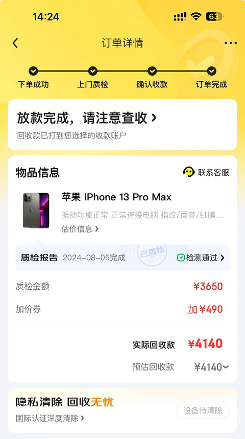 当时是13一出就从官网买的,好几个同事也买了,我还记得价格9799, 又花一千多买了保险,又买了一百多个手机壳 但买的是256g的, 最近内存告急了,换了个1T的,这个手机就没啥用了, 我还有个xr做备用机, 搜了下京东回收不错,就选了今天上门,估算价格就是四千多, 我原以为怎么着也得砍价顶多三千, 结果质检小哥一通操作,原价给的, 他还很可惜地说要是电池健康82以上就好了,价格能更高