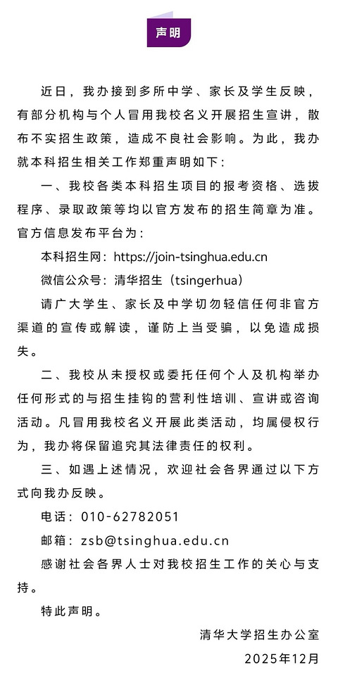 清华大学招生办郑重声明