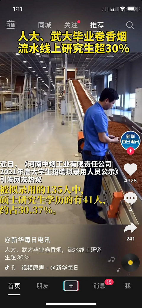 本文来源:时代周报 作者:陈佳慧 刘文杰卷烟厂“卷”到了什么程度?中国人民大学、武汉大学、郑州大学的毕业生纷纷上流水线打包装。近日,《河南中烟工业有限责任公司2021年度大学生招聘拟录用人员公示》(以下简称《公示》)引发网友热议。据河南中烟工业有限责任公司(以下简称“河南中烟”)官网,该《公示》发布于今年4月底,并于近日在网络引发关注。网友关注的焦点,是《公示》名单中拟录用人员的毕业学校和录用岗位