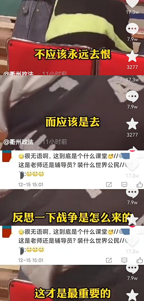 上海某职业学院的老师在课堂上发表针对南京大屠杀不正当的言论,说南京大屠杀的人数是没有数据支撑的,叫学生不要永远去恨。这是课堂,不忘国耻是每个人都应该牢记,我记得我无论那个阶段的老师讲到这些的时候都会说不忘国耻,虽然是和平年代,但是不能抹去的就是永远都不能抹去。而这个老师在传达些什么观念,最重要的是前几天还是国家公祭日