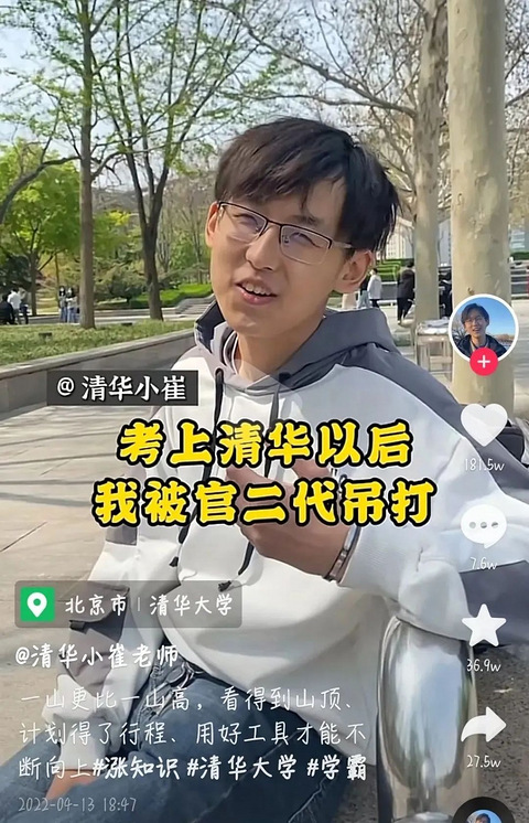 前两天,看了一个清华学生的视频,视频里,这个孩子满是遗憾。 他说,自己来自5线城市的一个普通家庭,17年通过努力,考上了清华。 但到清华后,他却受到了官二代的“吊打”。“吊打”他的,是合唱队的一个同学。起初俩人一起玩,一起聊物理、聊人生,觉得志同道合,很是投机。 偶然的,他发现这个朋友的父亲,是一个大学的院长,也就是俗称的“官二代”。 刚知道这点时,他觉得没什么,因为找了半天差距,他发现那个朋友性