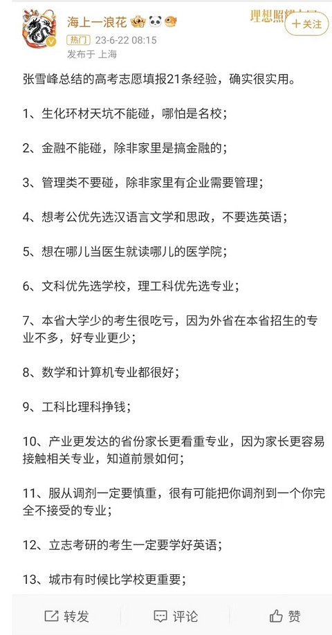 张雪峰总结的高考志愿填报21条经验,确实很实用