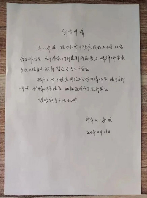11月19日,天津助学金事件当事人@僧丫 发布视频表示自己遭到网络暴力,并晒出自己手写的“休学申请”。