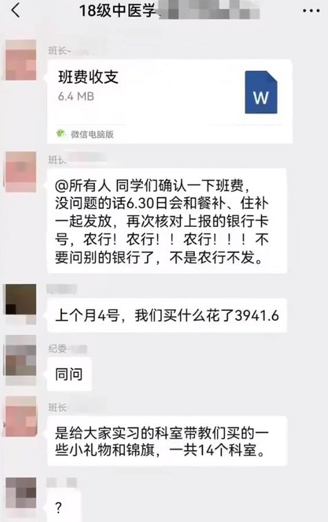最近,在一组网传的班级群截图中,某高校医学专业的班长与学习委员以经过商议为名,动用4000块班费给带教老师买礼物,还是学生查账的时候发现的。 大家懵了。 副班长与其他同学质疑:班委商议过?跟谁商议的?参与的人站出来说话。 班长回应,班费账目支出都有记录,不是擅自动用,经得起查。 而且一日为师终身为父,老师给我们实习机会,大家该懂得感恩。