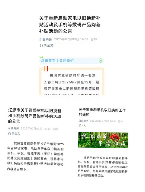 7月3日下午,吉林省长春市、辽源市、白山市、白城市等多地商务局发布《关于重新启动家电以旧换新及手机等数码产品购新补贴活动的公告》,成为首个官宣重启恢复家电、3C国补活动的省级地区。 来源公众号家电业