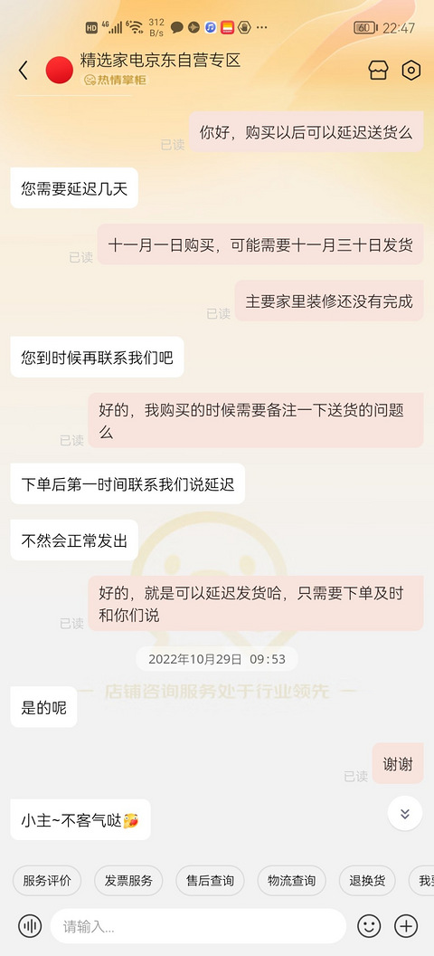 双十一活动在京东购买冰箱,前期已经和客服联系过延迟发货的问题,客服承诺也是可以的,结果双十一当天购买以后客服就换了一副嘴脸,时间不能改地址不能改,爱买不买,只能退货,退货也不处理,就放那里,明知道双十一活动都是当天,不退货就会影响我重新购买电器的优惠,联系京东客服,京东客服回复问题已经记录帮忙催一催后就直接挂电话,没办法,只能自己倒霉了。
