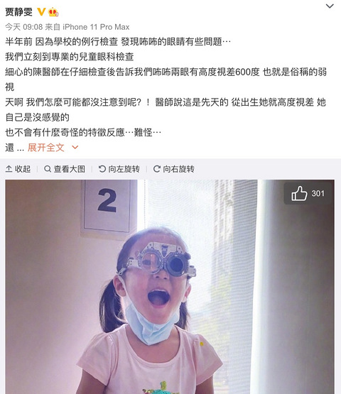今日,艺人贾静雯在微博发布长文,表示自己的女儿患有弱视,两眼视差达到600度,并且医生表示这种情况是天生的。贾静雯特意提到,还好发现的早,没有错过3-5岁的黄金治疗期。