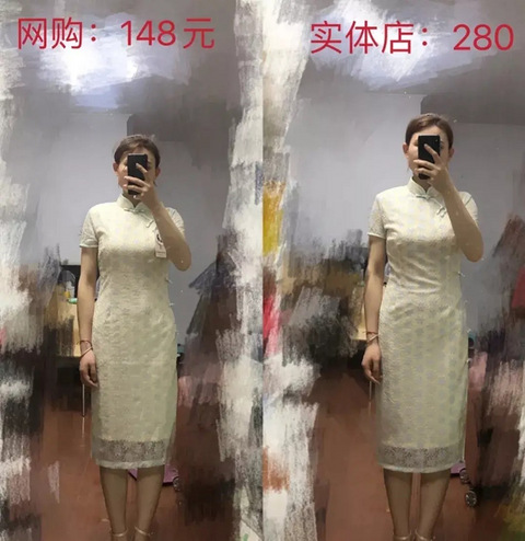 听你们的买回来对比了,今天刚刚收到货就试穿了两件,仔细对比区别。网购的皱一些,不知道是不是实体店的熨了,颜色有一些区别,但不是太大,细节处都差不多,都有线头,面料我摸起来完全一样,网购的领子和包边处会稍微硬一些,但是穿上感觉不出来,网购的腰会稍微大一点点,没有实体的贴身,拉链、表码的贴纸、裙子的走线、袖子的宽松度、裙子的长短都完全一样!你们自己感受值不值吧!
