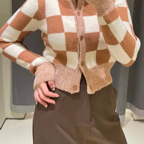 ur这件驼色的格纹针织开衫我觉得挺好看哒,穿着好看又显白