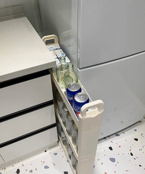 冰箱和台面有个小缝隙,正好屋头东西也放不下,就买了这种夹缝收纳小推车,太好用了吧!
