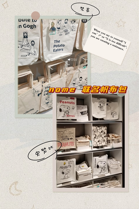 NOME x 梵高NOME x Snoopy联名帆布包 NOME x 梵高横版这款是先出的 ¥39.9 还有彩色款星空方便放资料 竖版最近推出有三个价格 ¥29.9 ¥59.9 (右下 2、3) ¥69.9(左上) NOME x SnoopySnoopy 70周年推出的周边价格同样是¥29.9 ¥59.9 ¥69.9(后面两个价格款式如下图)微信小程序可以购买搜索 nome小程序 进入后 搜索帆布